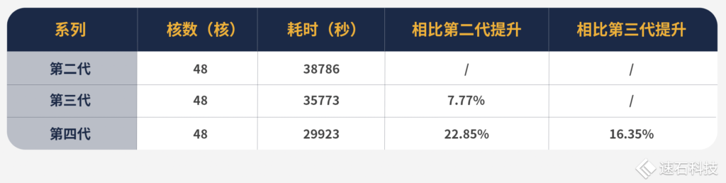 我們立馬搞來跑了一遍,為了對比參照,我們還拉上了第二代和第三代,并且把核數都按比例換算為48核。