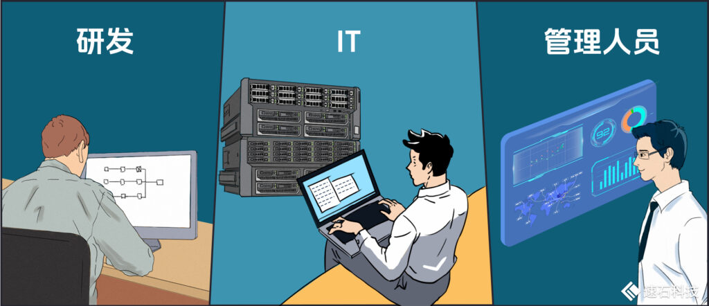 而芯片設計研發場景下,使用人群一般有三種:研發、IT、管理人員。