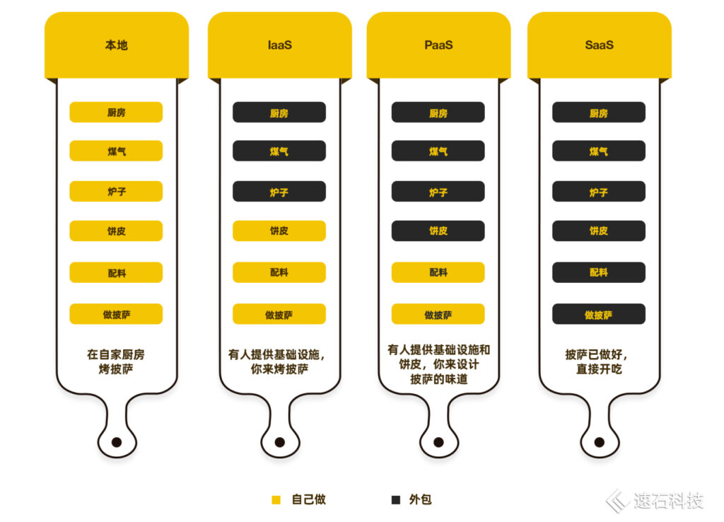 SaaS:有人直接做好了披薩,不用你的介入,到手的就是一個(gè)成品,你可以直接開吃。