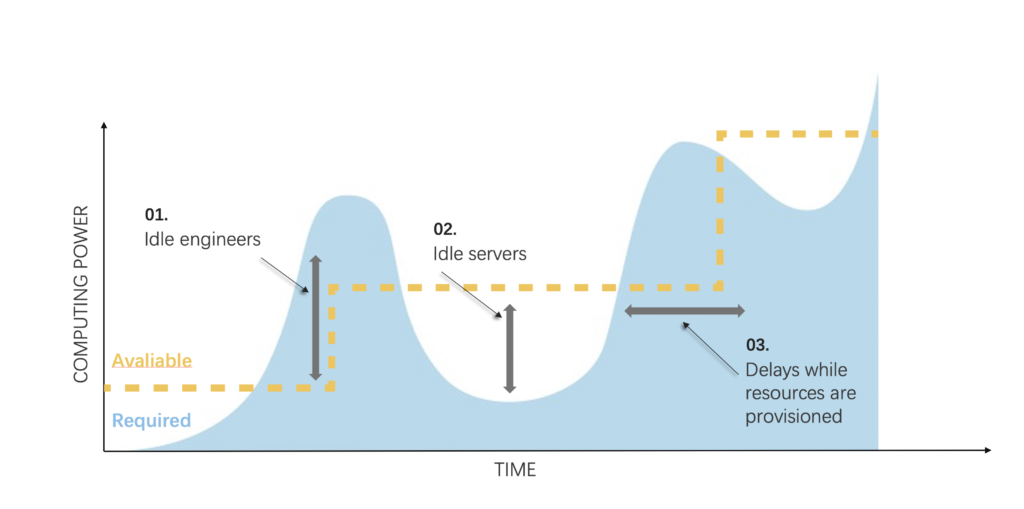 如果擴充本地計算集群,芯片設計公司需要在硬件、場地、人員、運維等方面進行大量投入,且芯片設計的算力需求存在波動:任務數量低谷時算力閑置,高峰時任務需排隊進行。
