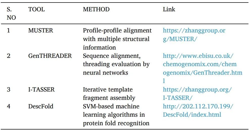 Fold recognition or threading:用于尋找具有可比折疊但沒有序列相似性的蛋白質。一個已知的蛋白質結構的序列被感興趣的目標的查詢序列所取代,對于該結構是未知的。然后用各種評分系統對產生的"threaded"結構進行評估。對每個數據庫的經驗確定的三維結構重復這一過程,提供與查詢序列最匹配的結構(表2)。它被運用于SBDD研究中。