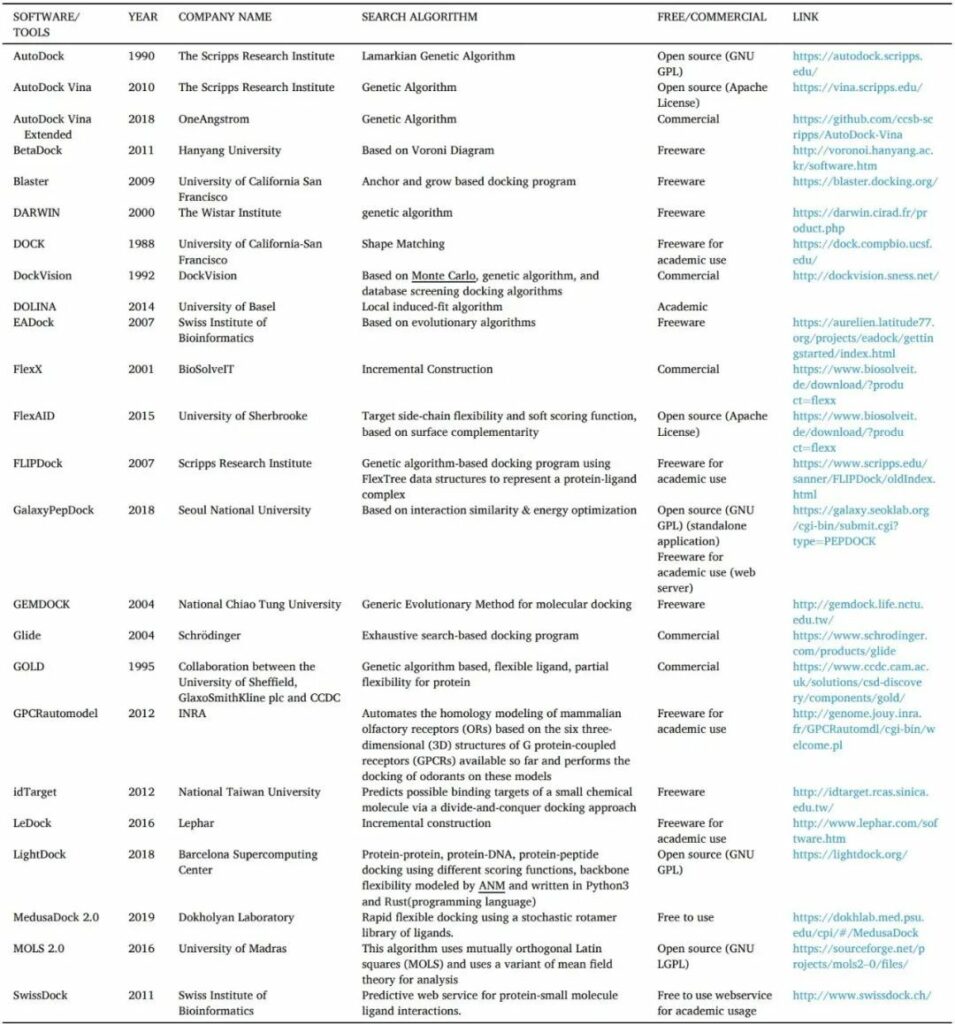 基于結構的虛擬篩選(SBVS):這是一種基于計算機的方法,用于在早期藥物開發項目中針對特定治療靶點搜索化合物庫中的新型生物活性化合物。SBVS中的化合物數據庫停靠在預定的靶標結合位點。除了預測結合模式外,SBVS還為對接的分子分配排名。該評級可以用作選擇有前途的分子的唯一標準,也可以與其他評估方法結合使用。進行實驗以確定所研究分子靶標上指示藥物的生物活性。SBVS包括四個步驟:(i)分子靶標準備(ii)化合物數據庫選擇(iii)分子對接和(iv)對接后分析。