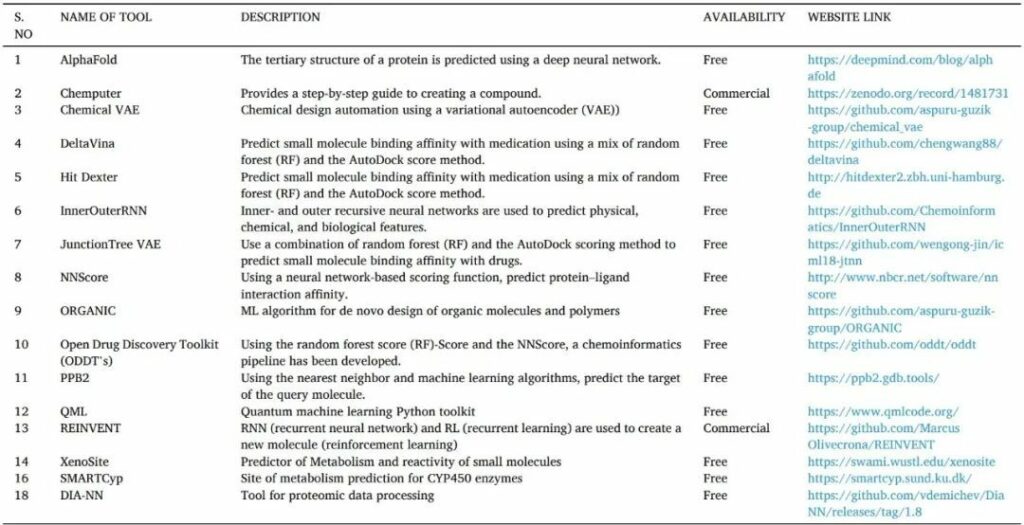 人工智能是通過機器或計算機對人類智能的模擬。它們通常通過訓練大量預先訓練的模型,分析相關性和模式的信息,然后使用這些模式進行預測來工作。人工智能可以識別hit和先導化合物,更快地驗證藥物靶標,并優化藥物結構設計。它還可以幫助靶向蛋白質的 3D 結構預測、蛋白質-蛋白質相互作用、藥物活性和從頭藥物設計(表13)。