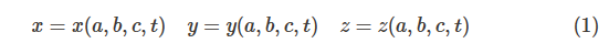 運動的拉格朗日公式總是與時間有關的。因為a、b和c是粒子的初始坐標;x、 y和z是相同粒子在時間t的坐標。拉格朗日流的運動描述: