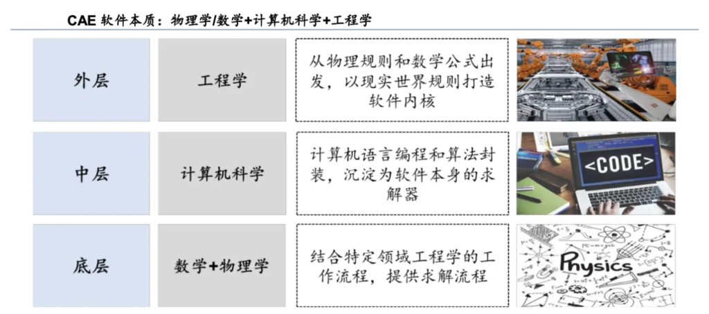 CAE軟件從本質(zhì)上來看,可以拆解為三層:數(shù)學(xué)+物理學(xué)(底層)、計(jì)算機(jī)科學(xué)(中層)、 工程學(xué)(外層)。