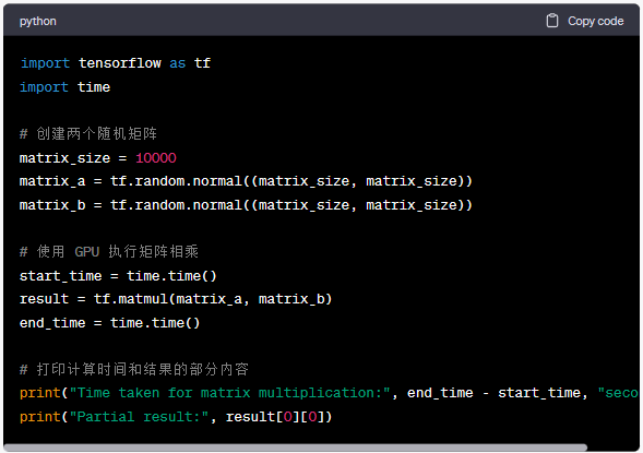 編寫測試腳本:創建一個簡單的 Python 腳本,使用 TensorFlow 來執行一個 GPU 計算任務。 以下是一個示例腳本,將對兩個隨機生成的大矩陣進行矩陣相乘,以測試 GPU 性能: